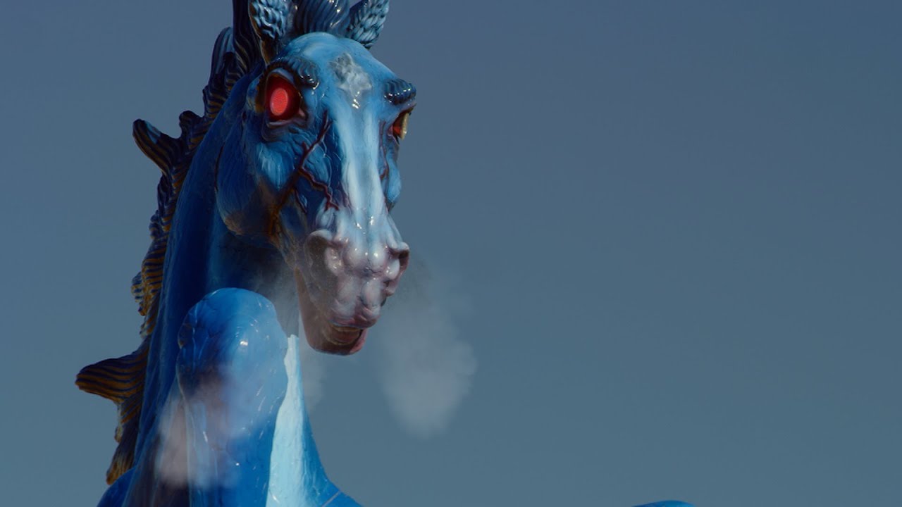 Above ground, the airport filled with art that no one would call comforting. A 32-foot demon horse with glowing red eyes at the entrance. Murals inside depicting genocide, cities in flames, and a new world order rising from the wreckage. Every piece was commissioned and approved. Someone chose these images.